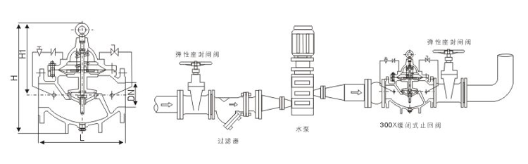 當(dāng)從進(jìn)口端給水時(shí),水通過微型過濾器、針閥、單向閥進(jìn)入主閥控制室,再經(jīng)過球閥排水至下游。因?yàn)獒橀y開度小于球閥開度,即主閥控制室的排水速度大于進(jìn)水速度,因此控制室壓力降低,作用于主閥盤下端的進(jìn)口壓力打開主閥向下游供水。 當(dāng)管道停止供水時(shí),若下游水開始回流,一部分回流水經(jīng)球閥進(jìn)入主控制室,由于單向閥作用,回流水不能從主控制室流出,引起主控制室逐漸升壓,緩緩關(guān)閉主閥。