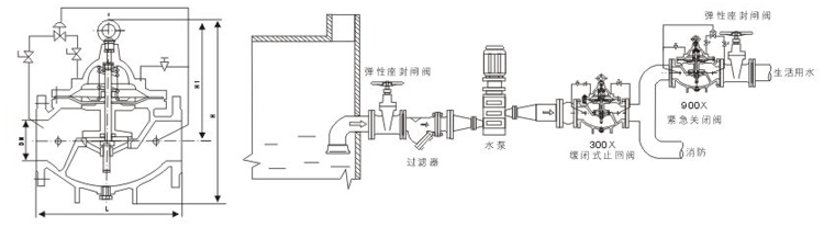 900X緊急關閉閥用于生活供水和消防供水并聯供水系統中,正常情況供生活用水,當火災發生時消防用水時,閥門自動關閉生活用水,確保足夠的消防用水。當消防停止用水時壓力減少,閥門自動恢復生活用水,該閥使系統無須另設專門的消防單獨供水管網,大大地節省了工程建設成本和日常的用水量。該閥控制靈敏、安全可靠、調試簡單、使用壽命長。