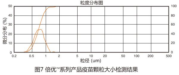 倍優(yōu)?系列產(chǎn)品每一個疫苗毒株均單獨接種雞胚,分別采毒后經(jīng)超高超微分離濃縮后再純化,高度去除雞胚尿棄液中的尿酸鹽、脂多糖等雜質(zhì),經(jīng)過高度純化和超高濃縮后,在進行抗體復(fù)配,確保抗原成分單一,從而保證乳化后的疫苗顆粒大小適中、均勻,有效刺激機體產(chǎn)生高而待久的抗體水平;倍優(yōu)?系列產(chǎn)品疫苗顆粒大小0.5~0.6μm ,該大小顆粒占95%以上(圖7)。