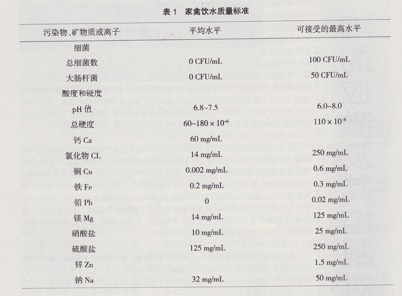 水對(duì)養(yǎng)分的消化、吸收、轉(zhuǎn)運(yùn)和廢物排泄有著重要的作用。水是廉價(jià)、容易得到,也是容易被忽略的重要養(yǎng)分。在大生產(chǎn)中通常會(huì)注意給水的數(shù)量,即會(huì)經(jīng)常檢查飲水乳頭的好壞,卻容易忽視飲水的質(zhì)量。實(shí)際上在生產(chǎn)中經(jīng)常遇到的雞群生產(chǎn)成績(jī)不正常,易患卵黃性腹膜炎及其他疾病,這種情況通常與飲水質(zhì)量有關(guān)。表1列出了家禽飲水質(zhì)量的相關(guān)標(biāo)準(zhǔn),在生產(chǎn)中重視飲水質(zhì)量會(huì)給種雞生產(chǎn)帶來(lái)事半功倍的效果。