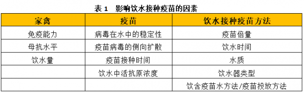 飲水接種疫苗的原則是向所有的家禽至少提供最小保護劑量的活疫苗,同時需防止現場野毒在家禽中擴散。因此,飲水接種疫苗的效果取決于多種與保持疫苗活性相關的因素、飲水接種操作方法和家禽健康情況三大類。具體見表1所示,忽略一個小細節,都有可能致使疫苗免疫失敗。