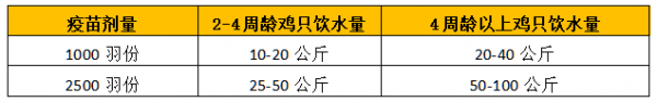 溶解疫苗所需的水量根據雞群日飲水量而定,大致的標準是:全天飲水量的1/5-2/5,如果是考慮肉雞或天氣炎熱時,飲水量可增加5~10%(參考下表)